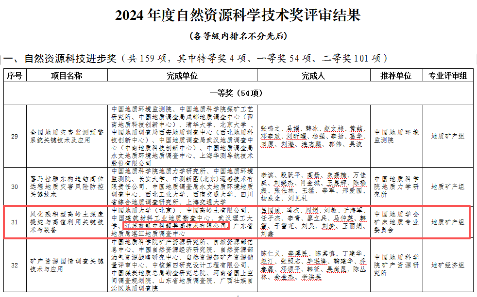 近日,自然资源部正式公布 2024 年度自然资源科学技术奖获奖名单,由中国地质大学(北京)主导,江苏旌凯中科超导高技术有限公司联合中国高岭土有限公司、中国建筑材料工业地质勘查中心、武汉理工大学、广东省地质局湛江地质调查中心共同完成的 “风化残积型高岭土深度提纯与高值利用关键技术与装备” 项目,凭借突出的技术创新与产业化价值,斩获科技进步奖一等奖。